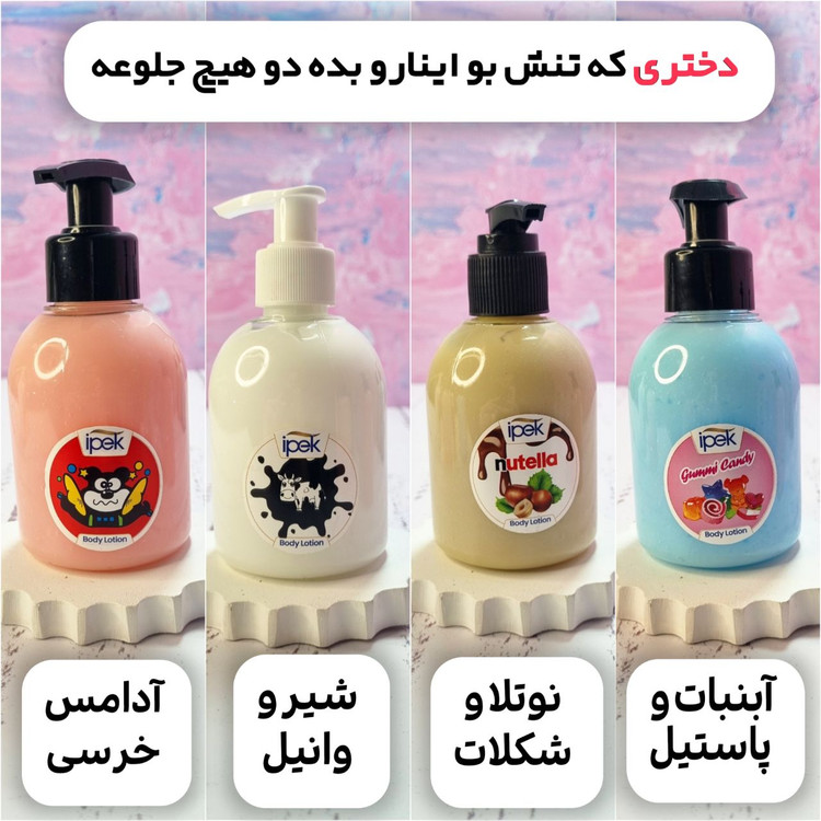 لوسیون بدن ایپک در ۵ مدل آدامس خرسی، پاستیلی ، شیر گاو ، نوتلا و موزی موجود می باشد
